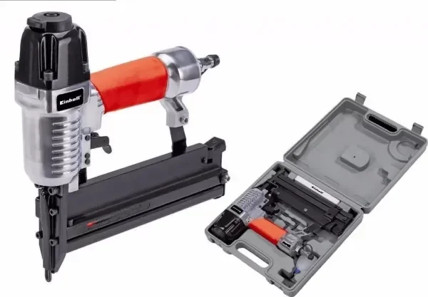 La herramienta está provista de un racor para la conexión de aire y de una salida de aire giratoria. Además, se incluyen 500 grapas de 5,7 x 25 mm, 1.000 clavos de 25 mm, así como 2 llaves allen para el ajuste y el mantenimiento del aparato.